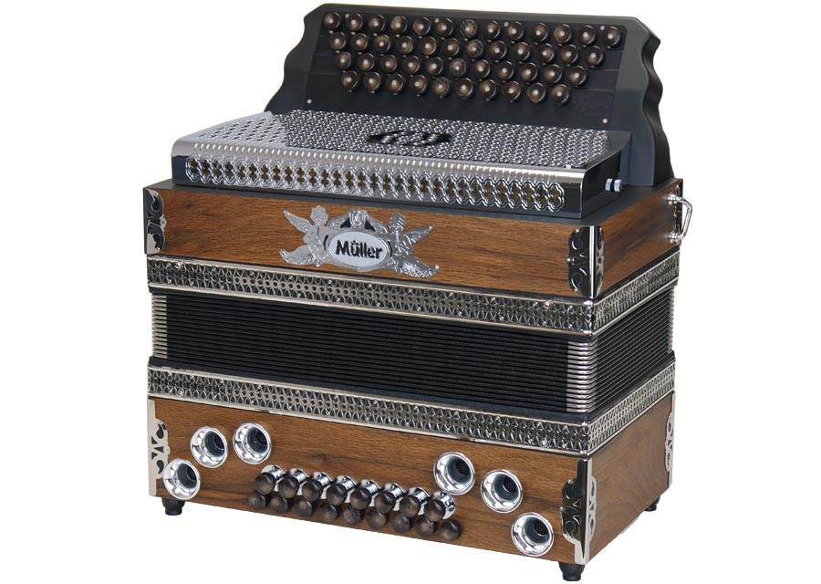 Hier sehen Sie die 4-reihige Harmonika Müller Stubaital aus der beliebten Alpin-Serie. Bei dieser Harmonika sind Durall Stimmzungen, edles Marmor-Eiche (matt lackiert) und Chrom-Beschläge verbaut - eine perfekte Einsteiger-Harmonika.